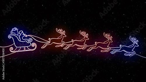 © Oleh, Fototapeta premium Santa claus flying sleigh with neon reindeer glowing at night