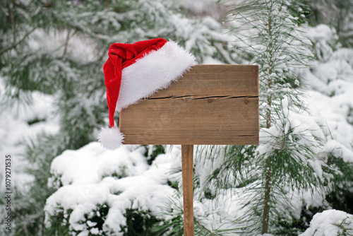 Fototapeta premium Santa Claus Hat on wooden road sign, nature background with pine trees and...