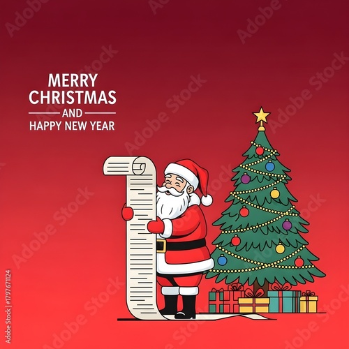 © VectorDesigner, Obraz premium Santa claus holding a long list of presents next to a decorated christmas tree with gifts