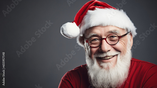 Naklejka premium Santa Claus in eyeglasses is looking at camera and smiling, on gray background
