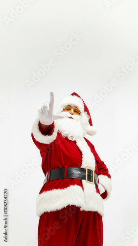 Fototapeta premium Santa claus in red suit pointing forward for christmas promotion and festive...