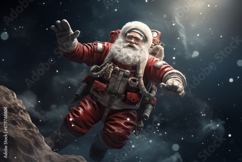 Fototapeta premium Santa Claus in space suit floating in space outside spaceship, moon...
