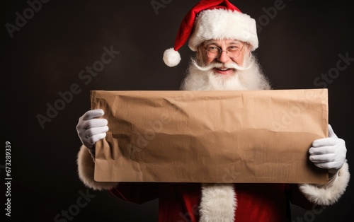 Naklejka premium Santa claus is holding a blank cardboard sign, space for text