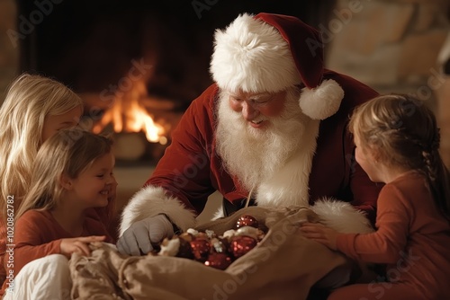 © Milos, Obraz premium Santa Claus joyfully shares gifts with delighted children seated around a crackling fireplace, enveloped in a warm, festive atmosphere, symbolizing happiness and generosity.