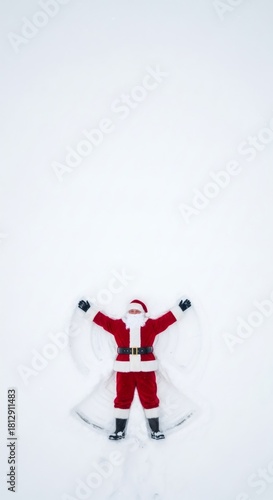 Obraz premium Santa Claus making a snow angel in pristine white snow. Christmas holiday fun and festive winter concept for seasonal greeting card design.