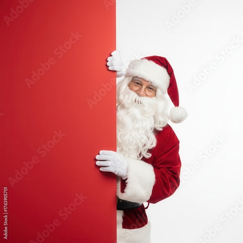 © Rizzz, Naklejka premium Santa Claus peeking from behind a bright red blank space, offering a cheerful holiday greeting