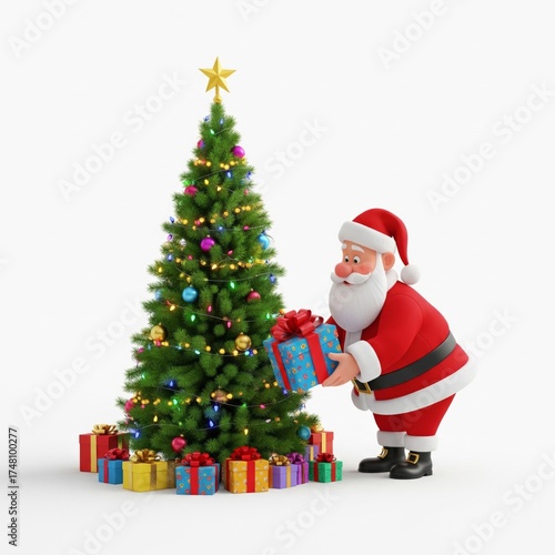 Fototapeta premium Santa Claus placing Gift near Decorated Christmas Tree on White Background