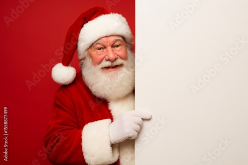 © Татьяна Евдокимова, Naklejka premium Santa Claus pointing his finger at a blank billboard on a red background, Christmas advertisement concept