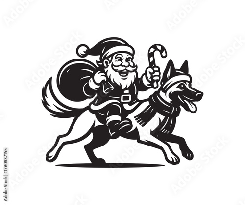 Fototapeta premium Santa Claus Riding German Shepherd Dog Vector – Funny Christmas Illustration, Santa with Candy Cane and Gift Bag