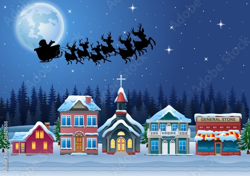 Fototapeta premium Santa Claus riding his reindeer sleigh flying in the sky