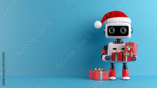 Fototapeta premium Santa Claus robot, adorned with New Year and Christmas gifts, stands on a...
