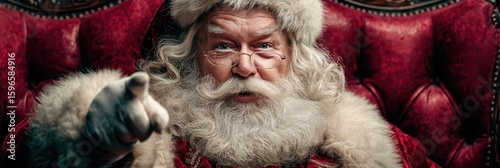 © Georg, Obraz premium Santa Claus sitting in a red chair, pointing, with a snowy background during the holiday season