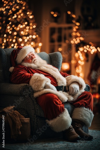© MNStudio, Naklejka premium Santa Claus sleeping in an armchair after delivering gifts. Cozy cabin, warm lights, peaceful Christmas scene.