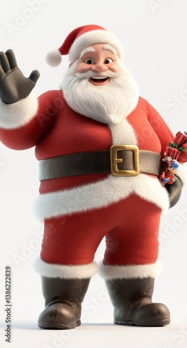 © AYESKIA, Fototapeta premium Santa Claus Waving Hand Holding Gifts on a White Background