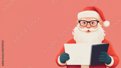 © Wave, Naklejka premium Santa Claus wearing glasses and reviewing a business proposal on a tablet, with space on the screen