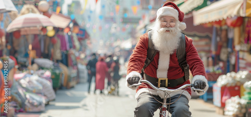 © 18042011, Obraz premium Santa Claus, wearing his iconic red suit and hat, rides a bicycle through a bustling Christmas market