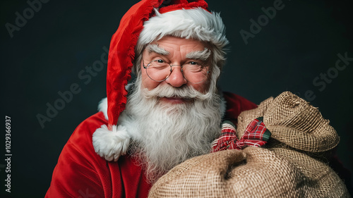 © Mariia, Naklejka premium Santa Claus with a bag of gifts. Winter postcard. Xmas. Happy New Year. Merry Christmas. Santa Claus walking with a full sack of Christmas gifts
