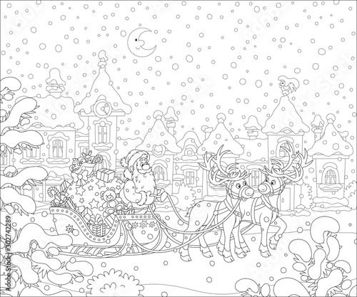 © Alexey Bannykh, Fototapeta premium Santa Claus with a big bag of holiday gifts in his celebratory decorated sleigh with magic reindeers in a snow-covered town on the snowy night before Christmas, vector cartoon illustration