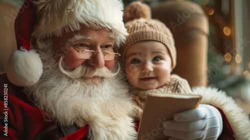 © svastix, Obraz premium Santa Claus with a white beard and red suit is joyfully reading a book to a cheerful baby dressed in a knit sweater and hat, capturing a warm Christmas setting with festive decor.