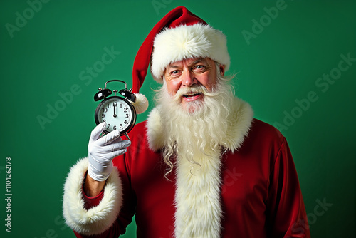 © ROMAN DZIUBALO, Naklejka premium Santa Claus with alarm clock in his hand on green background. It is midnight on the clock. Copy space. AI generative.