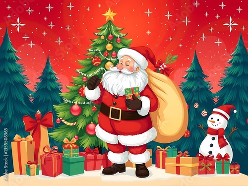 Fototapeta premium Santa Claus with Christmas Tree and Gifts, Merry Christmas Scene with Santa, Snowman, and Gift Boxes in Winter Wonderland, Santa Claus with Christmas Gifts and Decorated Tree – Festive Holiday Art