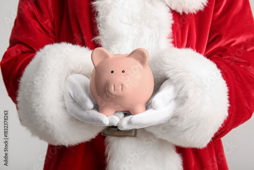 © Pixel-Shot, Fototapeta premium Santa Claus with piggy bank on light background, closeup