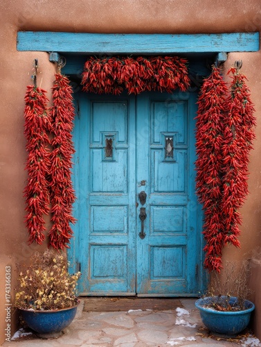 Naklejka premium Santa Fe, New Mexico: Chile Ristras Decking Doors for Holiday Season Decor