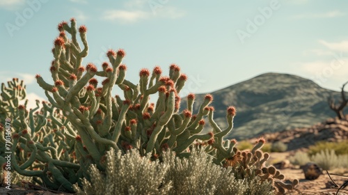Fototapeta premium Santa Fe with a close-up of a looming cholla cactus in the desert, showcasing...
