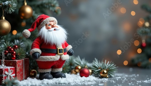 Obraz premium Santa figurine standing in front of Christmas tree with presents