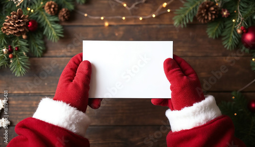 © Rhony, Obraz premium Santa hand holding a blank card mockup on a wooden background with Christmas decorations