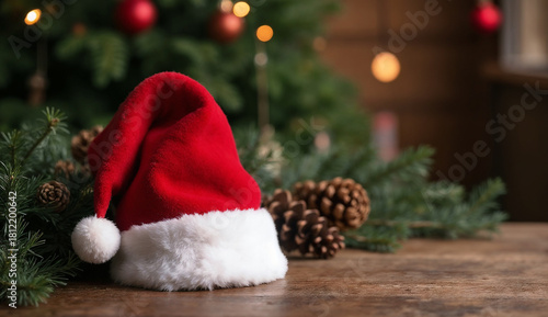 © Rhony, Obraz premium Santa hat on wooden table with christmas decorations againts christmas tree background.