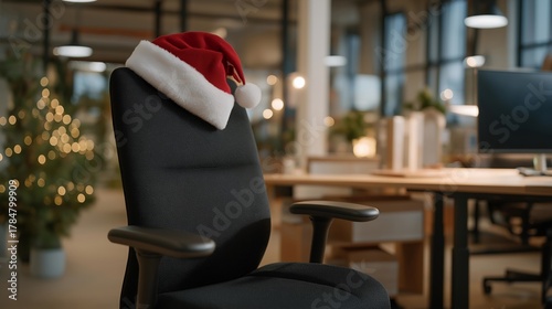Obraz premium Santa hat placed on an ergonomic office chair in a sleek, modern workspace...