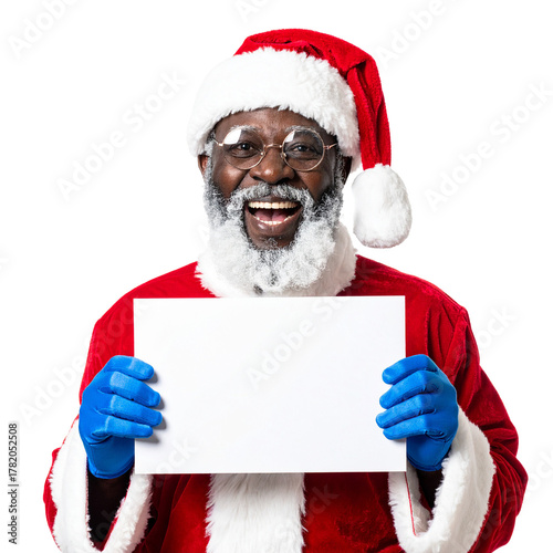 Naklejka premium Santa's Holiday Greeting: A joyful Santa holds a blank sign, ready to spread holiday cheer and embrace the spirit of the season.
