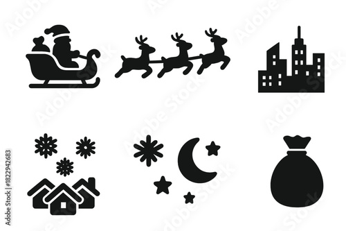 Naklejka premium Santa's Sleigh Icons. Santa Claus flying over the city. Filled icon set of Santa Claus flying over the city: