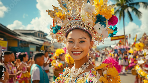 © Asahmed, Fototapeta premium Santacruzan, Filipino religious procession, Reyna Elena crowned with sparkling jewels, Emperor Constantine in intricate ceremonial robes, streets adorned with vibrant flower arches and banners
