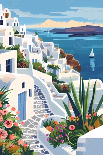 Fototapeta premium Santorini coast,seashore,Summer landscape,white houses. Travel in Europe. Poster,postcard,print,template