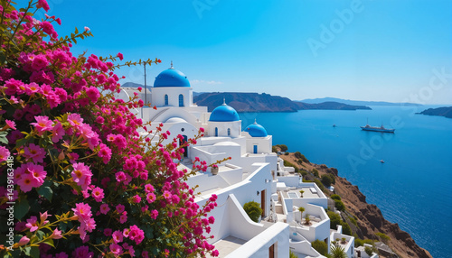 Fototapeta premium Santorini Island White Buildings and Blue Domes on Cliffside Overlooking Ocean