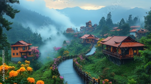 © NhV, Naklejka premium sapa valley city in the mist in the morning vietnam