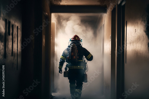 © Fox_Dsign, Naklejka premium Sapeur pompier dans un couloir d'immeuble avec de la fumée - illustration ia