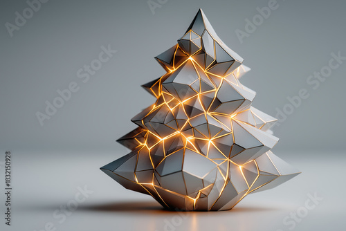 © JulieMeneghin, Fototapeta premium Sapin de Noël abstrait et conceptuel, composé de formes géométriques éclairées par des lumières LED dorées. Décoration de fête minimaliste, design moderne et élégant sur fond gris uni