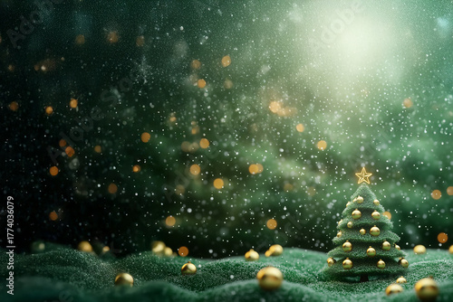 © Noble Nature, Naklejka premium Sapin de Noël miniature décoré de boules dorées sur fond vert scintillant avec neige et lumière diffuse, ambiance hivernale et féérique, Noël et fêtes de fin d’année avec espace négatif copyspace