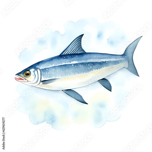 © chanjaok1, Naklejka premium Sardine in cartoon style. Cute Little Cartoon Sardine isolated on white background. Watercolor drawing, hand-drawn Sardine in watercolor. For children's books, for cards, Children's illustration.