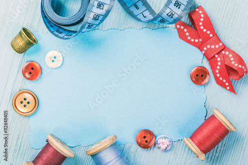 © cloudberry77, Fototapeta premium sartorial meter and scissors on the old wooden background