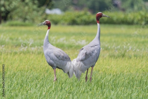 © Wirestock, Obraz premium Sarus cranes in a green field