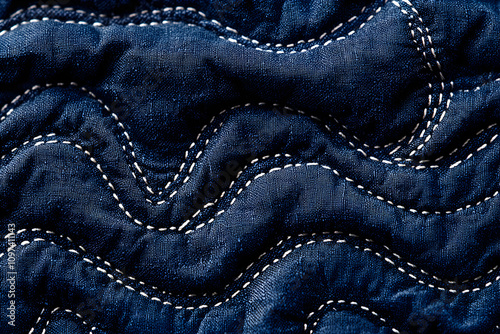 Naklejka premium Sashiko Quilting Detail: Blue Denim Textile, Wave Stitch Pattern, Macro Photography