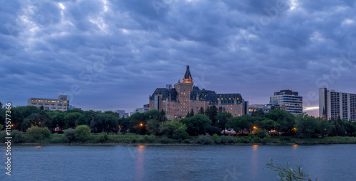 © Jeff Whyte, Obraz premium Saskatoon skyline at night along the Saskatchewan River.