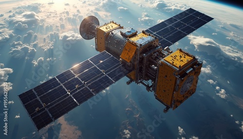 © Vadym, Fototapeta premium Satellite in orbit above Earth. Spacecraft with solar panels navigates atmosphere. Technology monitors planet surface. Global communication system. Science mission. Outer space vehicle. Earth