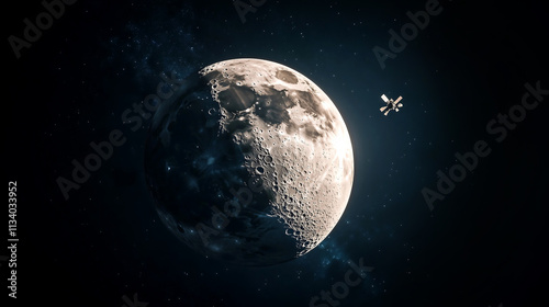 Fototapeta premium Satellite orbiting moon in cosmic space. Scientific and technological concept.