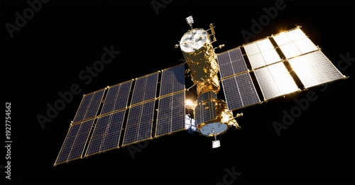 Fototapeta premium Satellite orbits Earth. Golden body connects to large solar panels. Bright...