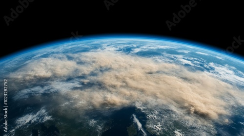 Fototapeta premium Satellite view of Earth with a large area covered in thick pollution, visible brown and gray clouds spreading across continents, environmental crisis concept